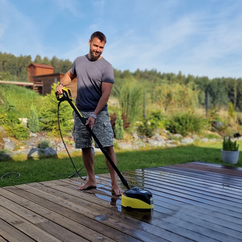 K práci používáme profesionální horkovodní vysokotlakou myčku s regulací tlaku a speciální rotační nástavec, který čistí dlažbu šetrně, pod správným úhlem a bez zbytečného stříkání do okolí.